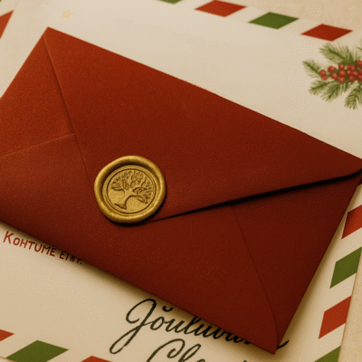 Personaalne kiri Jõuluvana Clausilt kaunis metallikpunases ümbrikus, millele on lisatud kuldne vahapitsat ning seotud elegantse paela ja ripatsiga.