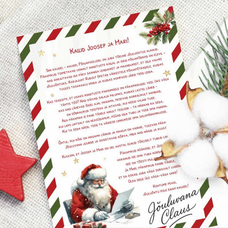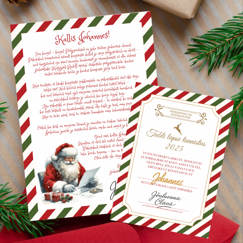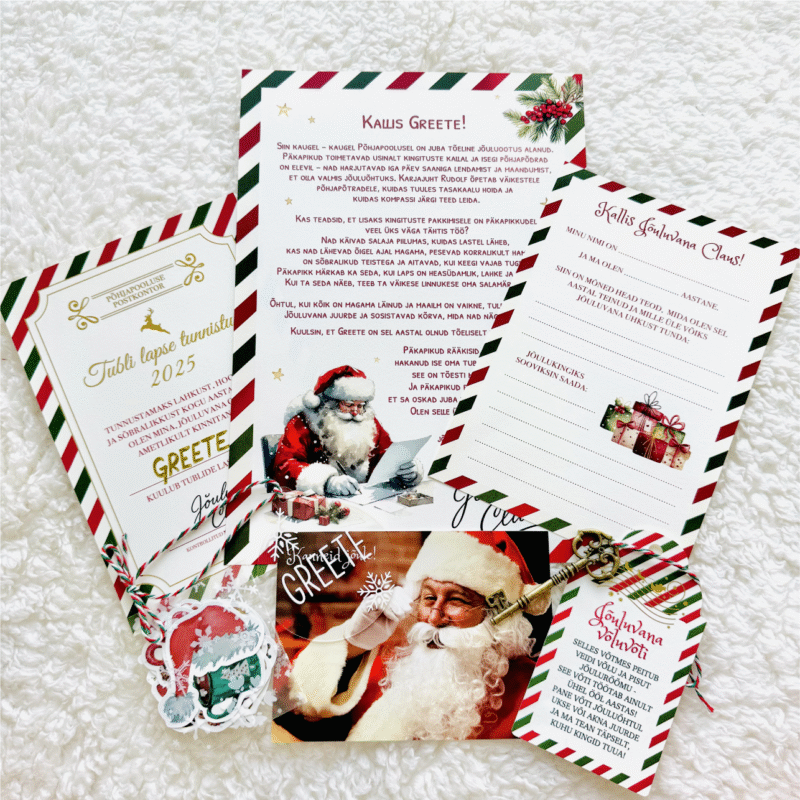 Ükskõik, kas valid personaalse kirja, uhke tunnistuse või kogu piduliku kingikarbi – igaüks neist on omaette elamus, mis loob jõuluootusest erilise kogemuse ning kingib lapsele usu imedesse, mida ta ei unusta kogu eluks.