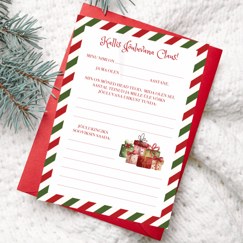 - Soovide nimekirja (A5), kuhu iga laps saab ise kirja panna oma head teod ja suurimad kingisoovid. See muudab jõulukogemuse veelgi isiklikumaks ja kaasavamaks.