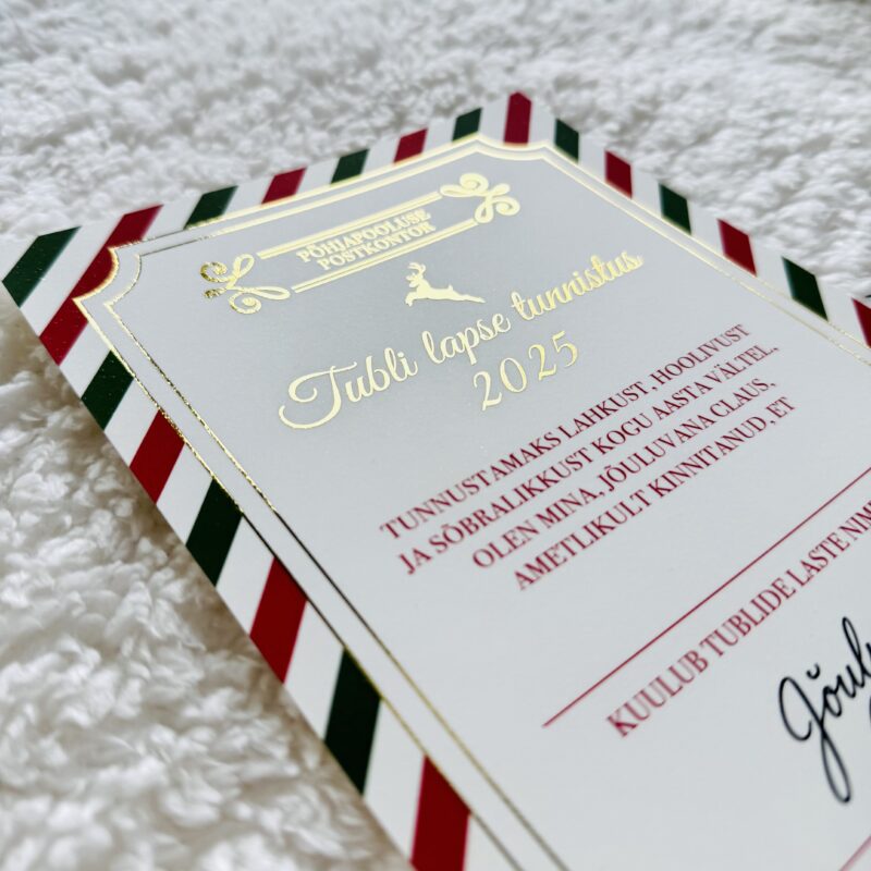 - Tubli lapse tunnistust (A5) – väärikas tunnistus luksuslikul paberil, mida kaunistab kuldne fooliumtrükk. Lapse nimi lisatakse käsitsi kuldse tindiga (soovi korral).