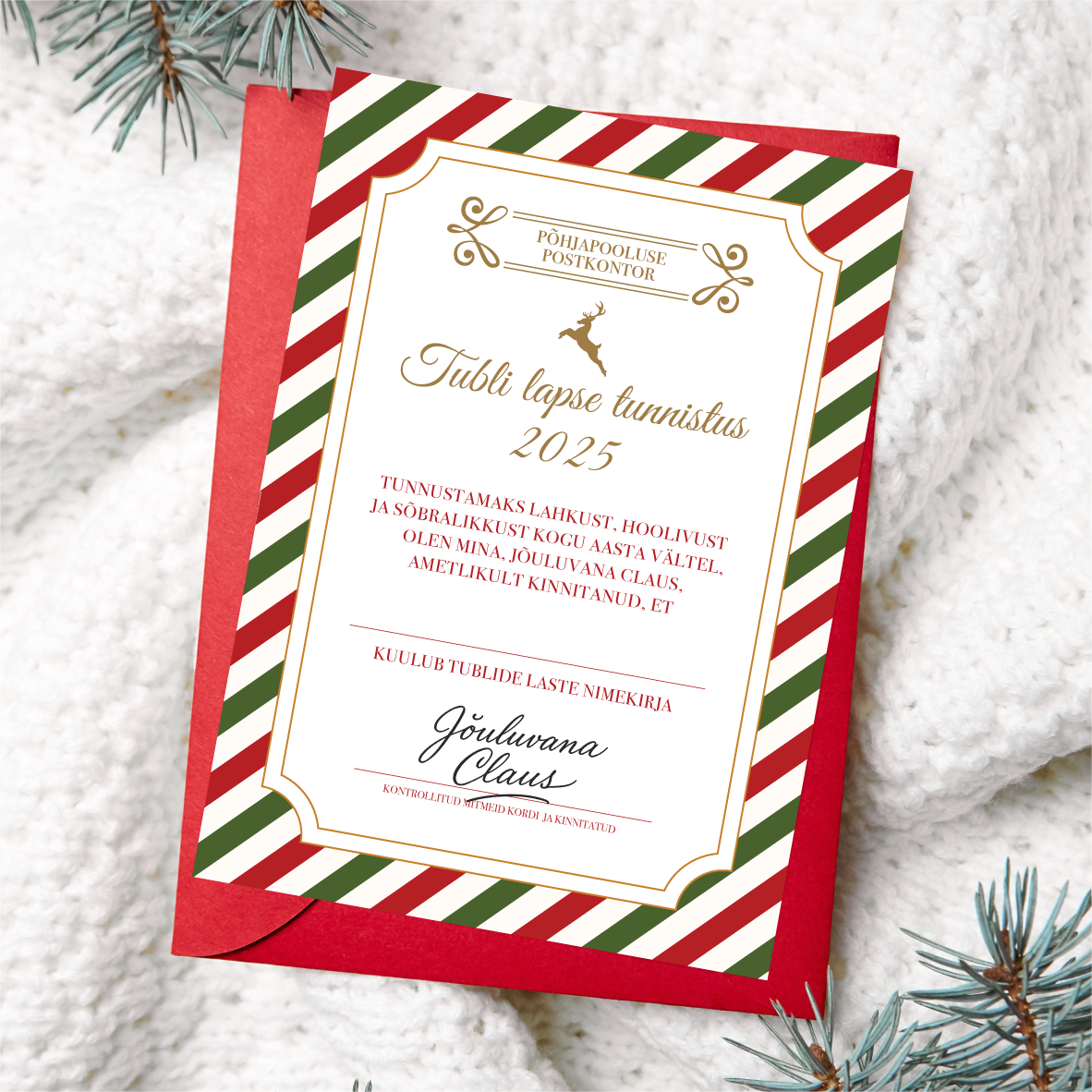 Iga tubli laps väärib tunnustust! See pidulik tunnistus on Jõuluvana enda poolt saadetud ja mõeldud lastele, kes on aasta jooksul häid tegusid teinud ning rõõmu jaganud.